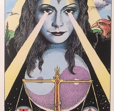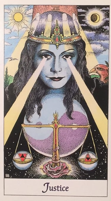 Avant même Le Pendu, La Justice agit comme un seuil. Elle représente la lucidité, l’exigence de vérité et l’alignement entre valeurs intérieures et vie vécue. Psychiquement, c’est la conscience d’un déséquilibre qui émerge, cela correspond au moment où une personne ne peut plus continuer sur sa voie car elle se sent trop en désaccord avec elle-même. Quelque chose doit donc être rééquilibré pour être juste. A ce stade, La Justice ne provoque pas encore la transformation, mais elle la rend inévitable.