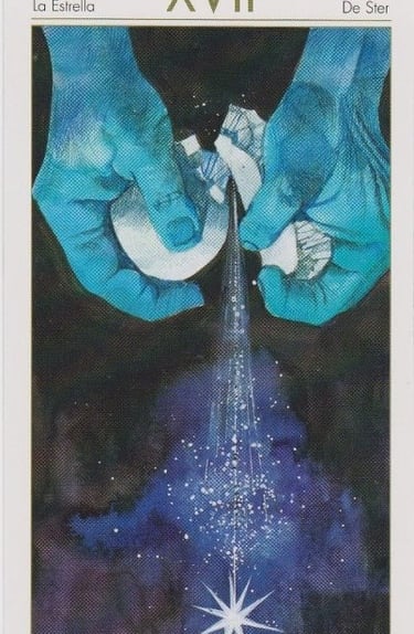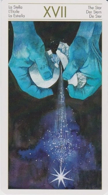 L’Étoile incarne l’espérance calme, la vérité nue et la confiance retrouvée. Après la traversée, quelque chose de plus authentique peut enfin émerger. Ce n’est pas encore l’accomplissement total, mais c’est une nouvelle boussole intérieure, un rapport plus doux à soi (et aux autres) et un sentiment d’alignement profond. L’Étoile marque un retour à l’essentiel, à l’authentique, on est enfin guidé par le Soi plutôt que par l’ego.